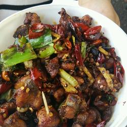 2. Deep-fry the submerged meat until it turns red.Remove from the pan and leave low-oil oil for the tempeh.Add red oil and pepper.Stir-fry a large amount of dried chili, onion, ginger, and garlic until fragrant.Add the fried chicken pieces and stir-fry a few times., sprinkle with chili powder, cumin powder and pepper, stir-fry and serve