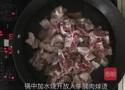 4.Add an appropriate amount of water to the pot and bring to a boil, then add the cut beef brisket and blanch it to remove the blood