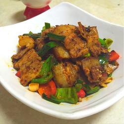 1. Boil the meat for ten minutes, remove and cool, slice green and red peppers into cubes, garlic sprouts and green onions.Slices of ginger and garlic