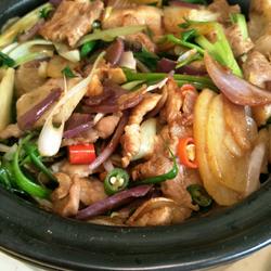 8.Add onions and potato slices, stir-fry, and add a little salt