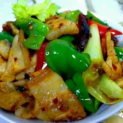 4. Place the pot on a high fire, add 10 grams of corn, add pepper and ginger slices, When fragrant, add the sliced pork belly and stir-fry for 2 to 3 minutes.When the oil pops out from the pork belly, add the bean paste and stir-fry for 1 minute to add the flavor.Add dried red pepper and scallions and continue to stir-fry for 2 to 3 minutes.Add green pepper, red pepper, soy sauce and other seasonings, stir-fry over high heat for 2 minutes, then remove from the pan and serve.