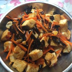 5.Put in oil and sauté garlic until fragrant, add shredded carrots and fungus, stir-fry, then add a spoonful of spicy bean paste and stir-fry evenly, put in the tofu and stir-fry together, add gravy and drain.It's ready for disc.