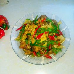 11. Pour in the chopped peppers and stir-fry them into red oil.