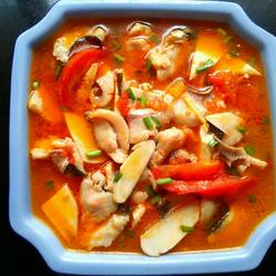 3. Then add an appropriate amount of boiling water to the pot, leaving the ground Add the tomato slices, bamboo shoot slices, and minced ginger into the pot and simmer for 5 minutes.