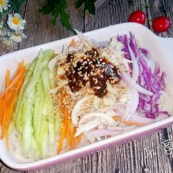 6.Put the noodles into a bowl and add chopped vegetables, shredded chicken and minced garlic