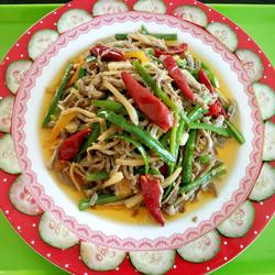 7. Heat 70% oil in a pot, stir-fry shredded beef and set aside.