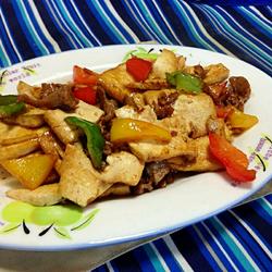 4.Pour the half-cooked tofu slices and beef slices into the pot and turn quickly Stir-fry, add a few drops of dark soy sauce, add a little warm water, wait until the soup is ready and it is ready to serve