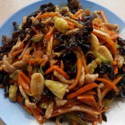5. Add the shredded carrots and stir-fry the shredded pork for a while