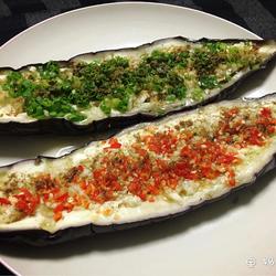 4.Put the steamed eggplant into a plate and top with chopped green onion, minced garlic and chili according to your own taste
