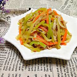2. Cut the tenderloin into shreds, add salt, cooking wine, light soy sauce, and starch to marinate for a while.Cut peppers and carrots into shreds.Slices of green onion and garlic are set aside.