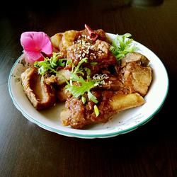 10.The fire collects the juice , stir-fry occasionally to avoid burning the pot.When the soup is thick, add three spoons of rice vinegar, stir-fry minced garlic, and place on a plate;