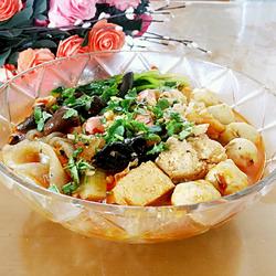 5. Cook for 2 to 3 minutes, until the wide noodles become soft, pour in the meatballs, White fungus, frozen tofu and boiled.