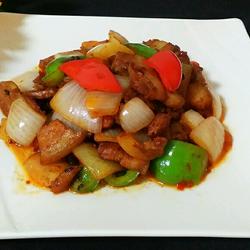 2.Pork belly slices , dice onions, dice red peppers, ginger, and mince garlic