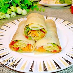 13. Spread sesame sauce and chili sauce on the cake, add onion shreds, carrot shreds, potato shreds, and colorful Shredded pepper and coriander segments.