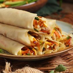 17. Spread some sweet sauce on the pancake.Arrange the fried vegetables and shredded eggs on the crust.