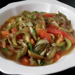 3.Wash the wok clean, add an appropriate amount of peanut oil, and heat the oil to 5 layers Add Sichuan peppercorns and stir-fry until fragrant.Take out the Sichuan peppercorns.Then add dried chili peppers and ginger and stir-fry until fragrant.Stir-fry until the eggplant becomes soft.Stir-fry the tomatoes for a few times.Then stir-fry for a few times with seasoned salt and oyster sauce.Finally, stir-fry.Add MSG into a thin layer of gravy, chopped green onion and it’s ready to go!