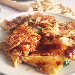 7.After the eggs have set slightly, turn the cold noodles over and sprinkle with coriander and onions.