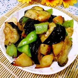 2. Peel potatoes and cut into prismatic pieces, cut long eggplants into hob pieces (soak in clean water for half an hour to prevent oxidation), cut green peppers into pieces, green onions, ginger, Mince the garlic