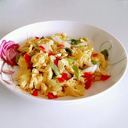 4. Add the stir-fried red pepper and green onion, add a little water and salt, and stir-fry for a while Ready to serve.