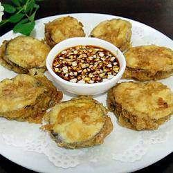 9.Put cooking oil into the pot and add the eggplant wrapped in egg liquid.Fry until golden brown on one side.