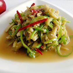 9. Pour in shredded green and red peppers, add salt and chicken essence !