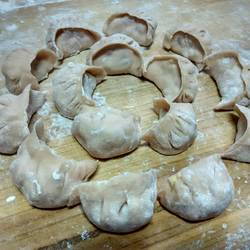 17.Put the tomato and egg filling into the dumpling wrapper.