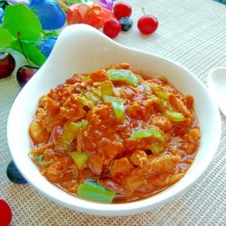 7. Dice green pepper , chopped green onion into the pot at the same time and stir-fry together