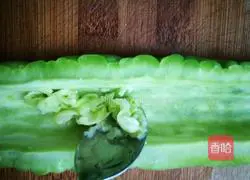 2. Cut the bitter melon into two halves, remove the seeds and white membrane.If you want the taste not to be particularly bitter, use a small spoon to scrape off the white film on the inner layer of the bitter melon