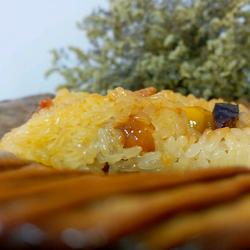 14.Take a piece of lotus Leaves, spread flat on the tray, spread a layer of glutinous rice on the lotus leaves, and then put other ingredients in it