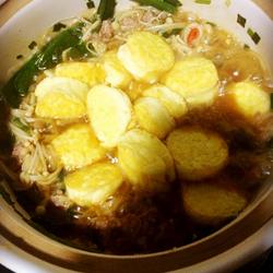 2. Pour an appropriate amount of oil into the casserole, sauté the onion, ginger, garlic, garlic and small pepper until fragrant.Add minced meat and stir-fry, add enoki mushrooms and stir-fry, pour water until the enoki mushrooms are covered, add oyster sauce, dark soy sauce to color, add tofu, cover the pot and simmer for five minutes