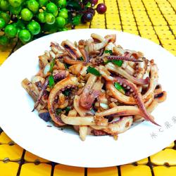 8. Add squid, cumin, cumin powder, salt, light soy sauce, and oyster sauce, Stir well.