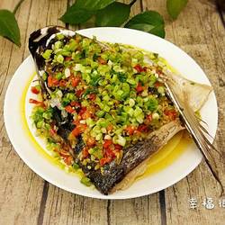 10. After the fish head is steamed, place it on a plate and sprinkle with chopped green onion.