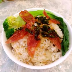 12. Stir the rice evenly so that the cured meat and rice are fully mixed.Every grain of rice is covered with the aroma of cured meat.Serve it in a bowl.Serve with vegetables and dipping sauce