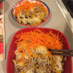 8. Pour the saozi soup over the bowl of noodles, flip the noodles with chopsticks to fully absorb the flavor, and add the radish Shredded bell peppers are placed in a noodle bowl.The noodles are ready.