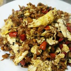 3.Put oil in the pot, scramble the eggs first, and set aside.First, add the dried peppercorns and saute until fragrant, add the grandma's vegetables and stir-fry, add the fried eggs, mix chicken essence, oil and soy sauce, stir-fry, take out the pan, and serve on a plate.
