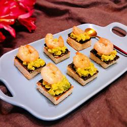 1. Prepare ingredients: 1 avocado, 100 grams of yogurt, 2 slices of whole wheat toast.6 pieces of seaweed sandwich.12 cooked shrimps.
