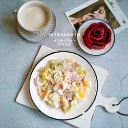 8. The nutritious vegetable, egg, and ham slice salad is completed.Make it if you like.Simple and quick nutrition.