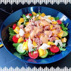 1.Prepare the ingredients.Wash chicory, cucumber, cherry tomatoes, and mango and set aside.Canned tuna, low-fat salad dressing, low-fat sweet sauce, and black pepper are ready.
