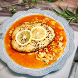 19.Pour into a large plate, put the warmed cod on top, squeeze in half a lemon juice.