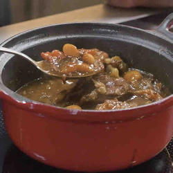 6.Cook in red wine.After the alcohol evaporates, add water, white beans, lotus root, Jinhua ham, light soy sauce, and dark soy sauce., bay leaves, rock sugar.