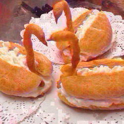 9.Put the puffs before eating Cut off 1/2 of the top, then cut the cut off top into two halves to form wings.Pour whipped cream into the lower half, pipe fresh cream into the middle, cover the wings, and insert the roasted neck into the body.