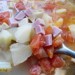 5.Pour more water over the vegetables, then bring to a boil over high heat, then reduce to low heat and cook until the potatoes become rotten, pour in the ham and continue to cook over low heat