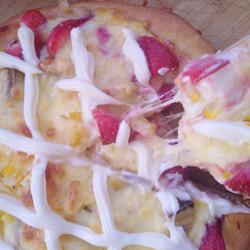 6. Take out the pie crust, brush with tomato sauce, spread a layer of summarilla cheese, and sprinkle Order some corn kernels, put strawberries, oranges, banana pieces on it, and sprinkle a layer of cheese.