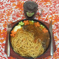 10.Heat on the gas stove Steak plate; add cooked pasta, fried poached eggs, fried steak, carrot flowers, cucumber flowers, and finally pour the prepared tomato sauce.You're done.