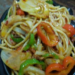 1. Put the pasta into a pot of boiling water and cook, drain the water and set aside.Cut onions into shreds and green and red peppers into rings and set aside