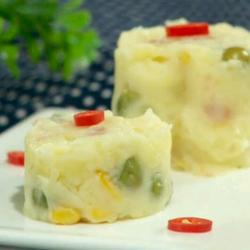 4.Crush the potatoes into puree and put Add ham, green beans, and corn kernels, squeeze in an appropriate amount of salad dressing, then pour in a small amount of milk, add half a spoonful of salt, stir evenly, and press it into a heart shape with a mold, and you are ready to enjoy