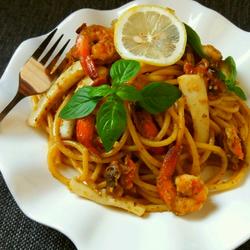 Italian long pasta ( 200g ) | Sea shrimp ( 6 pieces ) | Hairy Clam ( 10 pieces ) | Cuttlefish ( 1/4 ) |