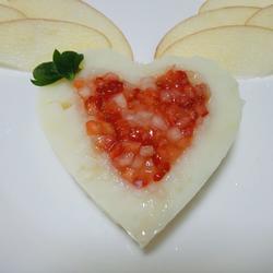 8. Use a mold to press the mashed potatoes into a heart-shaped pendulum Plate, draw another heart shape on top of the heart-shaped mashed potatoes, scoop out some mashed potatoes from the heart shape drawn on the mashed potatoes, and then sprinkle the chopped strawberries inside the small heart shape.Drizzle honey evenly over strawberries.Place the previously washed strawberry leaves in a corner of the heart.