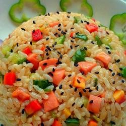 7. Remove from the pot, place on a plate and sprinkle with black sesame seeds for decoration, a little sour and sweet taste The fried rice is ready.