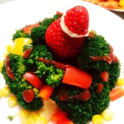 4.Plate broccoli and red pepper.Decorate with strawberry slices and whipped cream, then top with tomato sauce.